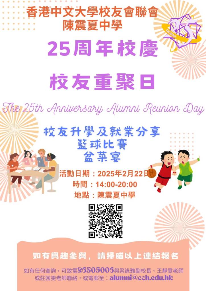 如各位有興趣參與以上活動,請填妥QR CODE報名。如有任何問題,可致電26305006與梁副校長、王靜雯老師或莊茜雯老師聯絡,亦可電郵至:alumni@cch.edu.hk